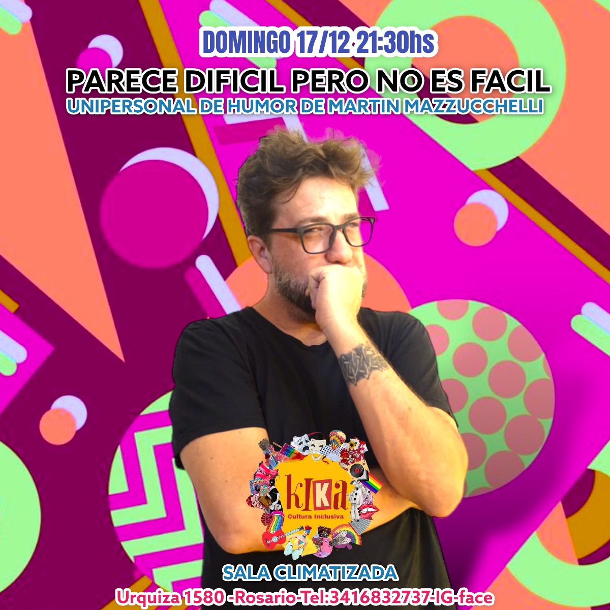 Este domingo 17, el comediante oriundo de Galvez (no Villa Gobernador Galvez) Martin Mazzuchelli despide el año y el show «Parece dificil pero no es facil» , en Kika (Urquiza 1580)